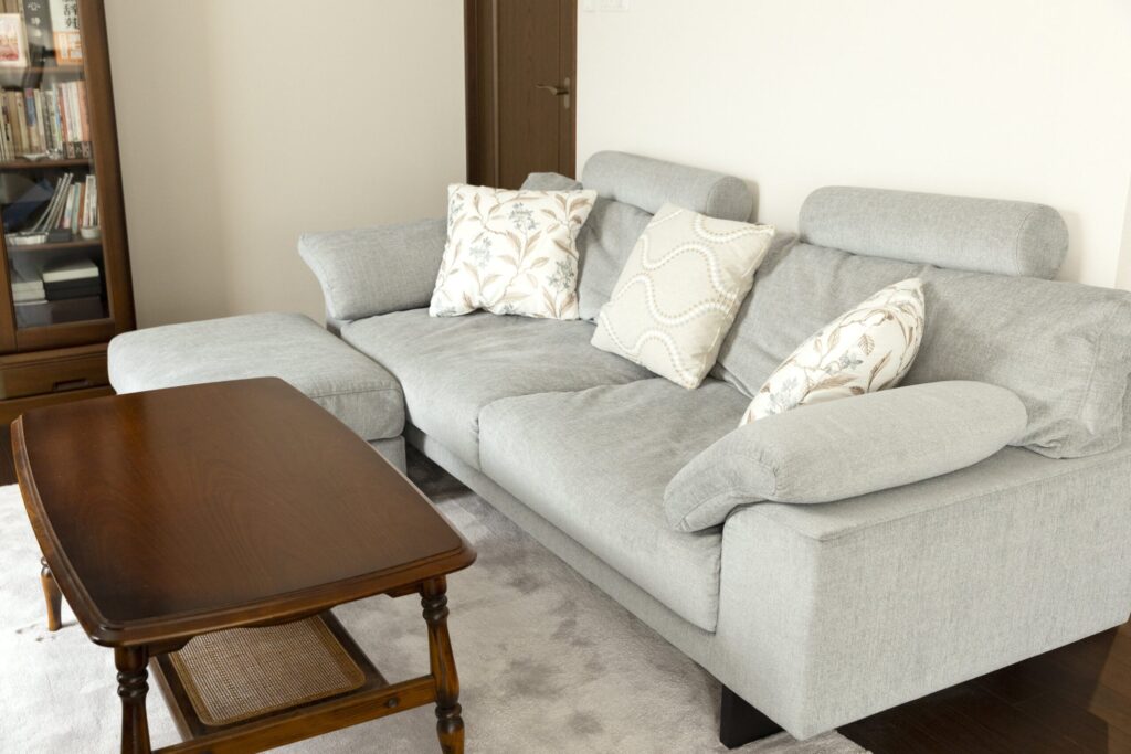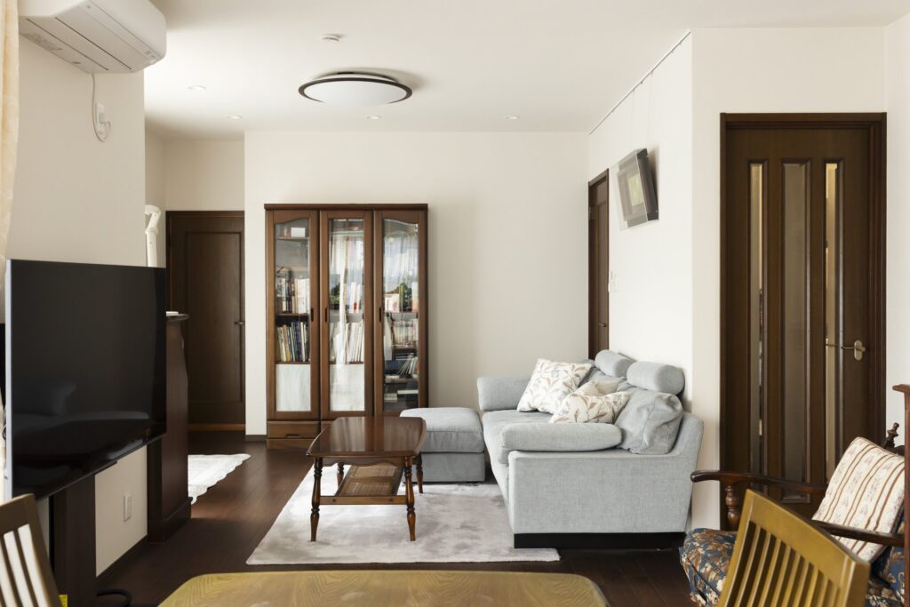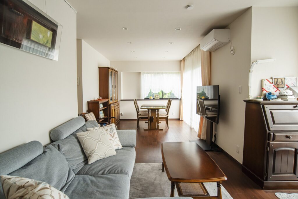 ソファテーブル、ダイニングテーブルもお持ちのものをそのまま利用。元の床の色が濃いブラウンだったので同じ色合いのDAIKEN「ジオナチュラル」を導入しました。