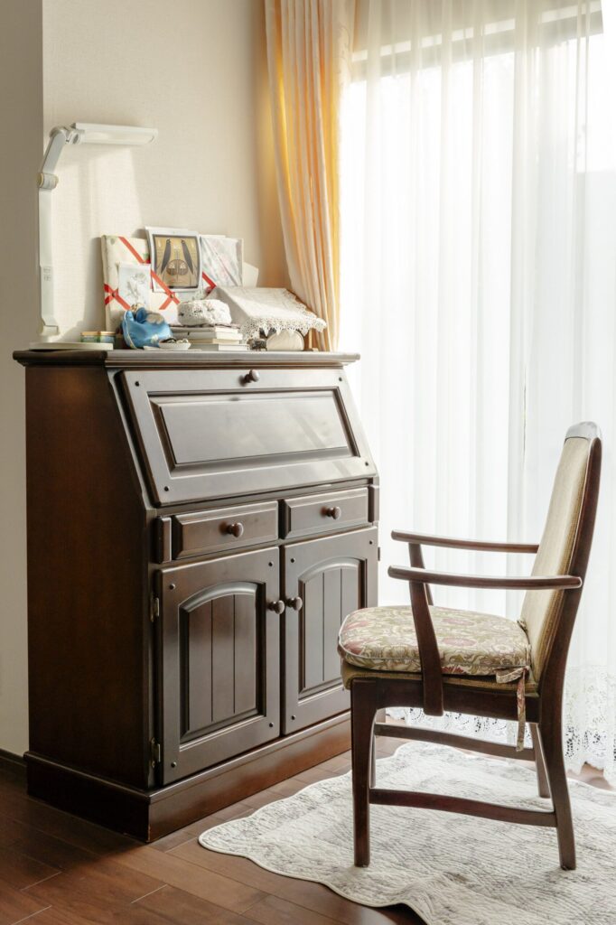 奥さまのワークスペースを別室に作る案もありましたが、LDの一角に据え、お持ちのライティングデスク、椅子を設置しました。ご両親から受け継いだ大切な家具もご家族を見守ります。