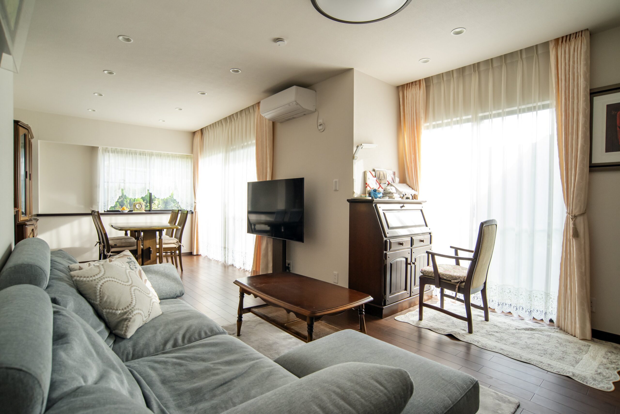 リビングコーナーのソファは、奥様とお嬢様が心地よさを重視して厳選したもの。奥様はカーテンなどファブリック選びもされたそうです。